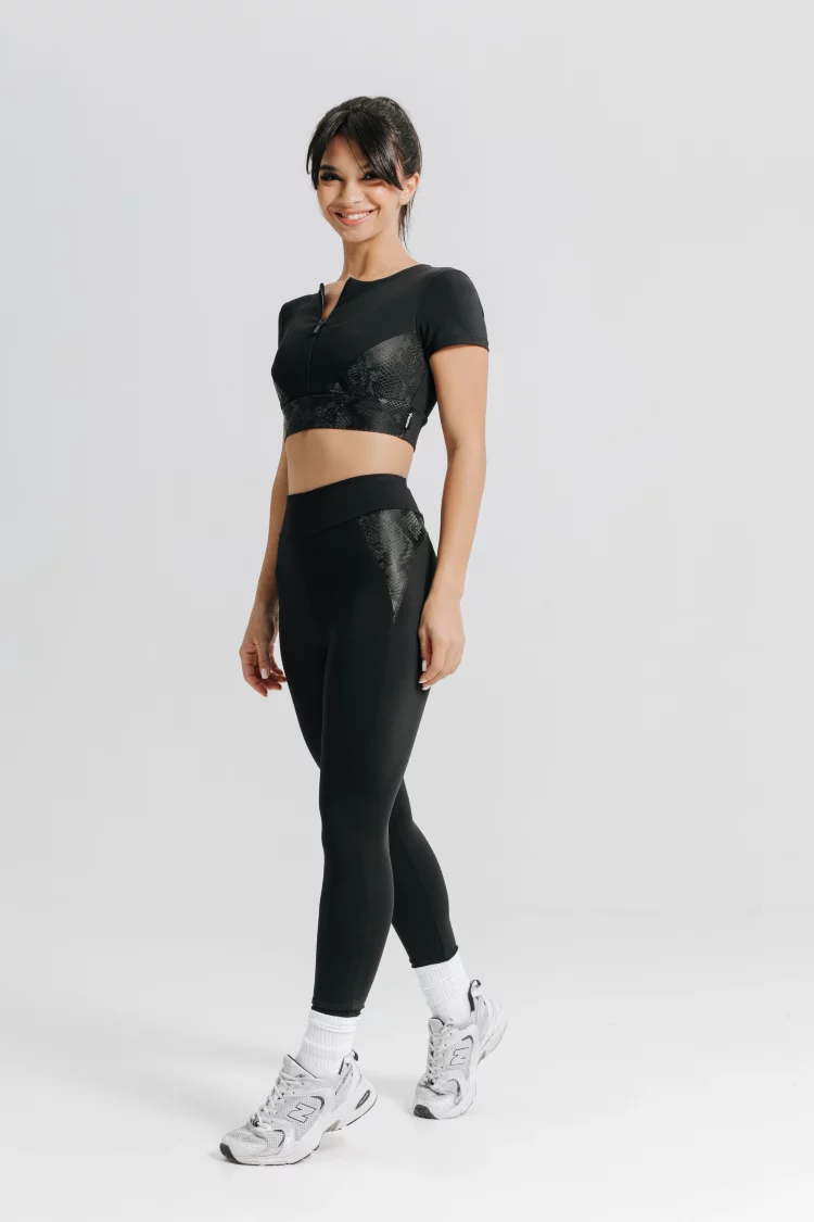 - Топ прилегающего силуэта, длина до линии талии. - Плотно прилегает к телу, не подтягивается во время движения, дает максимальное ощущение комфорта. - U-образная горловина. - Плотный, матовый материал с акцентными вставками питон. - Молния слайдер, которая крепко фиксируется в любом месте, можно застегнуть под горло или расстегнуть до комфортного положения. - Без чашек. - Подойдут для занятий фитнесом, йогой, танцами, пробежек на свежем воздухе и активных тренировок.. Состав: 83% полиамид 17% эластанХарактеристики